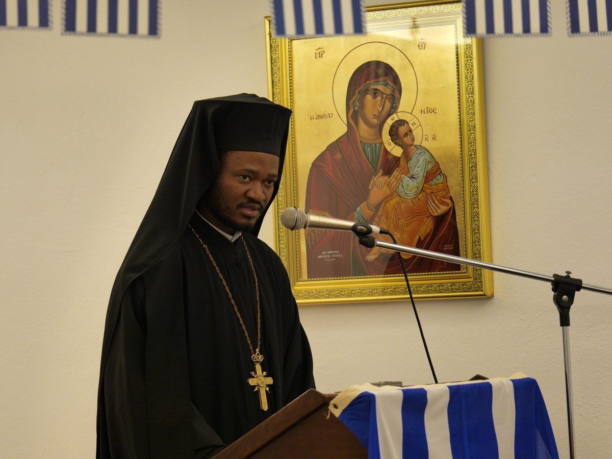 – Χαιρετισμός του Έξαρχου Πατριαρχείου Αλεξανδρείας, Σεβ. Μητροπολίτη Γουινέας κ. Γεωργίου από τον εκπρόσωπο Πανοσ. π. Αθανάσιο